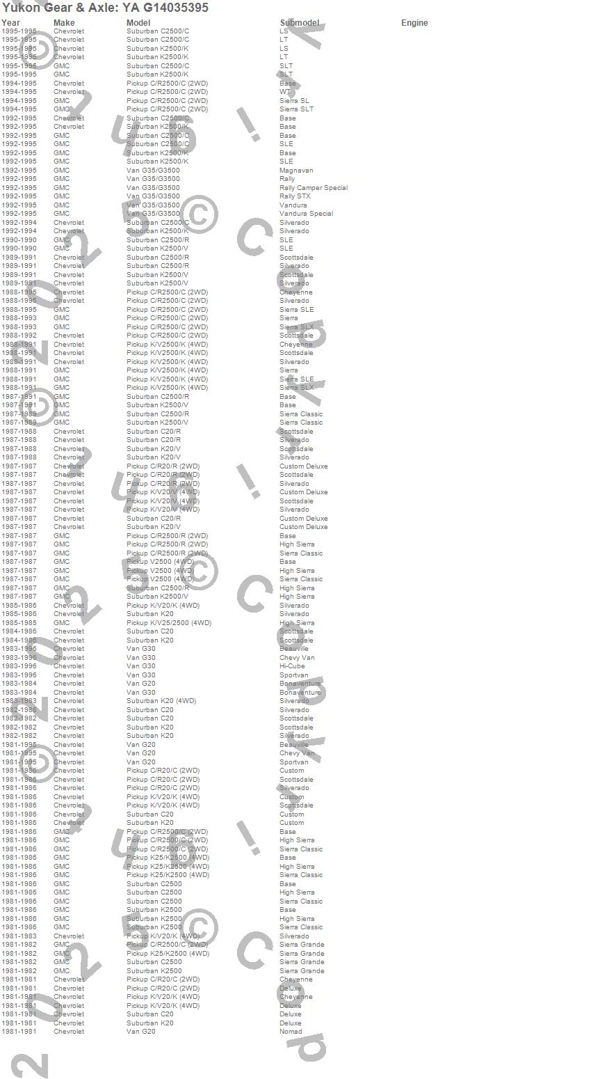 C20 Pickup, C20 Suburban, C2500 Pickup, C2500 Suburban, G20 Van, G30 Van, G35/G3500 Van, K20 Pickup, K20 Suburban, K2500 Pickup, K2500 Suburban, K2500 Suburban (Canadian), R20 Pickup, R20 Suburban, R2500 Pickup, R2500 Suburban, V20 Pickup, V20 Suburban, V2500 Pickup, V2500 Suburban more…