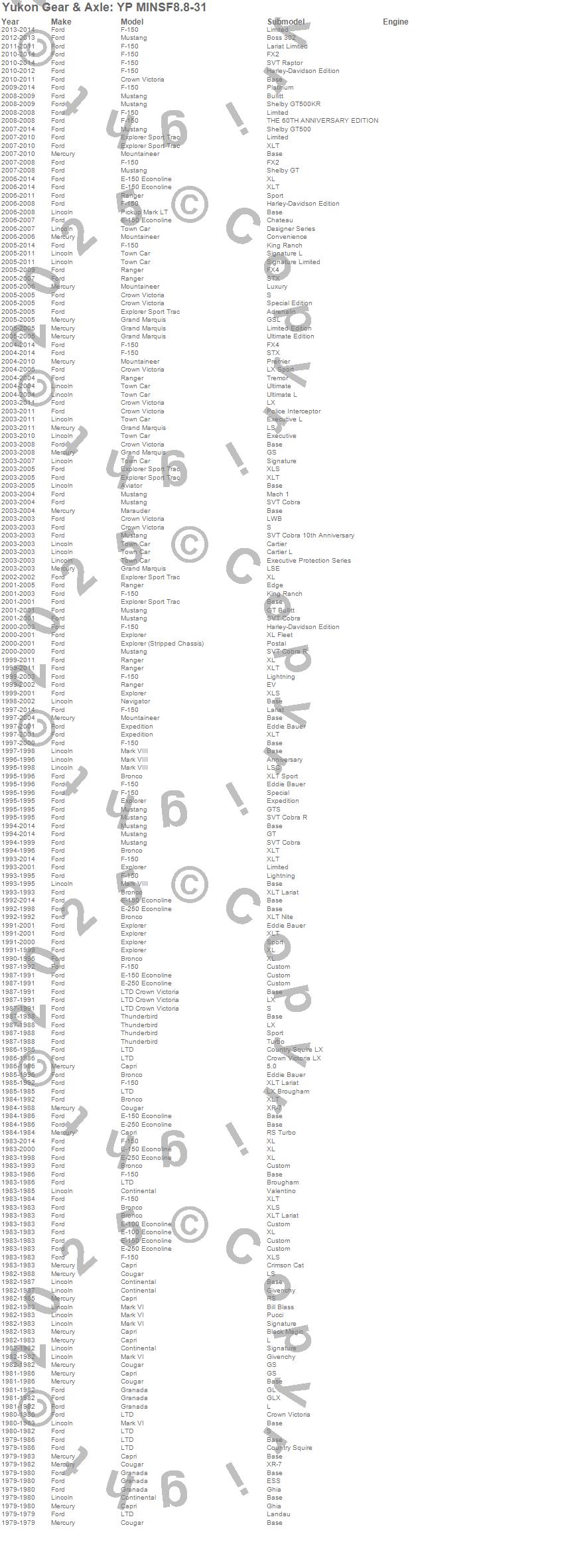 Aviator, B3000, B4000, Bronco, Capri, Continental, Cougar, Crown Victoria, E-150 Econoline, E-150 Econoline Club Wagon, Expedition, Explorer, F-150, F-150 Heritage, Granada, Grand Marquis, LTD, LTD Crown Victoria, Mark VI, Mountaineer more…
