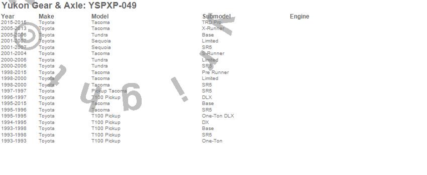 Below is an abreviated list of applications for the Cross Pin Shaft. 4Runner, Sequoia, T100, T100 Pickup, Tacoma, Tundra, Toyota, 2013, 2012, 2011, 2010, 2009, 2008, 2007, 2006, 2005, 2004, 2003, 2002, 2001 more…
