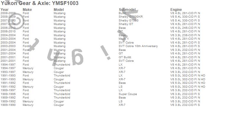 Below is an abreviated list of applications for the Yukon Mighty Axle Seal. Capri, Cougar, Mustang, Thunderbird, Ford, Mercury, 2011, 2010, 2009, 2008, 2007, 2006, 2005, 2004, 2003, 2002, 2001, 2000, 1999, 1998 more…
