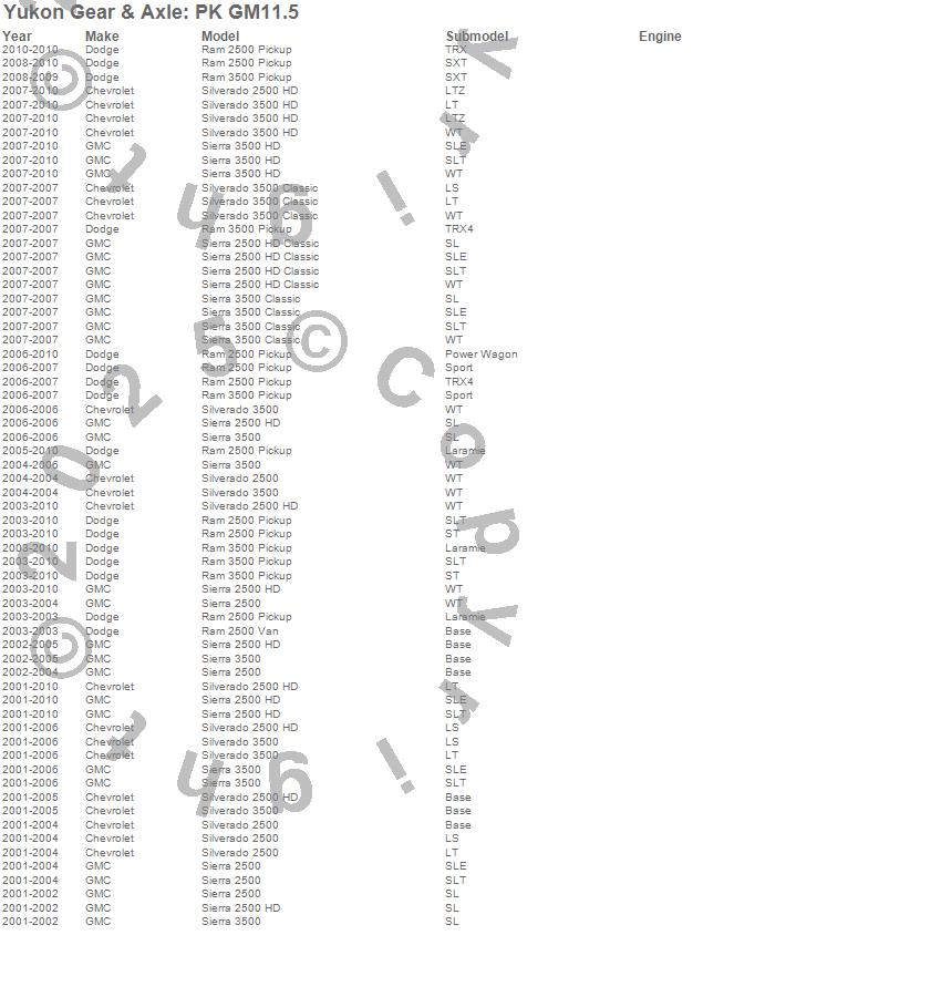 Below is an abreviated list of applications for the Pinion Install Kit.