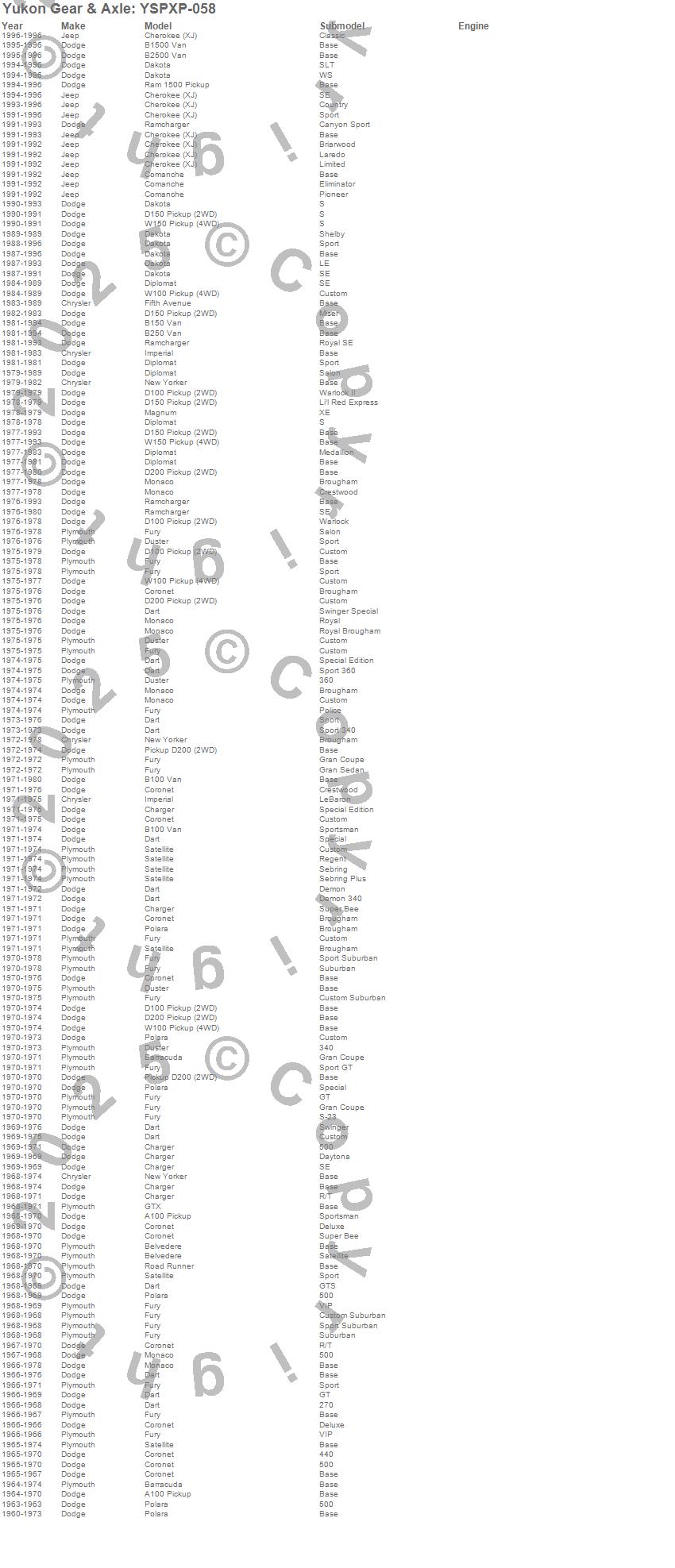 B100 Van, B150 Van, B1500 Van, B250 Van, B2500 Van, Barracuda, Belvedere, Charger, Cherokee (XJ), Comanche, Coronet, D100 Pickup, D150 Pickup, D200 Pickup, D300 Pickup, Dakota, Dart, Diplomat, Duster, Fifth Avenue more…