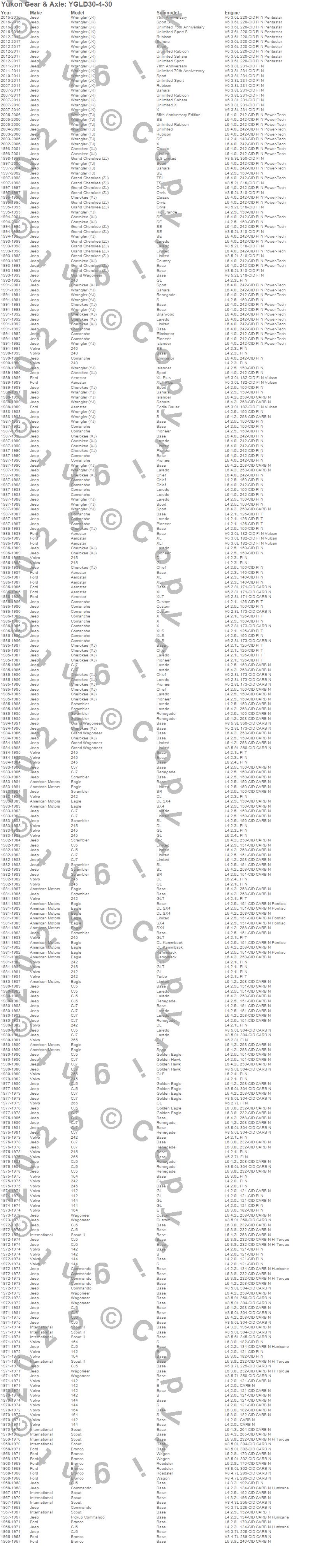 Aerostar, Bronco, Cherokee (XJ), CJ5, CJ6, CJ7, Comanche, Commando, Grand Cherokee (ZJ), Grand Wagoneer, Liberty, Scout, Scout II, Scrambler, Wagoneer, Wrangler (JK), Wrangler (TJ), Wrangler (YJ), Ford, International more…