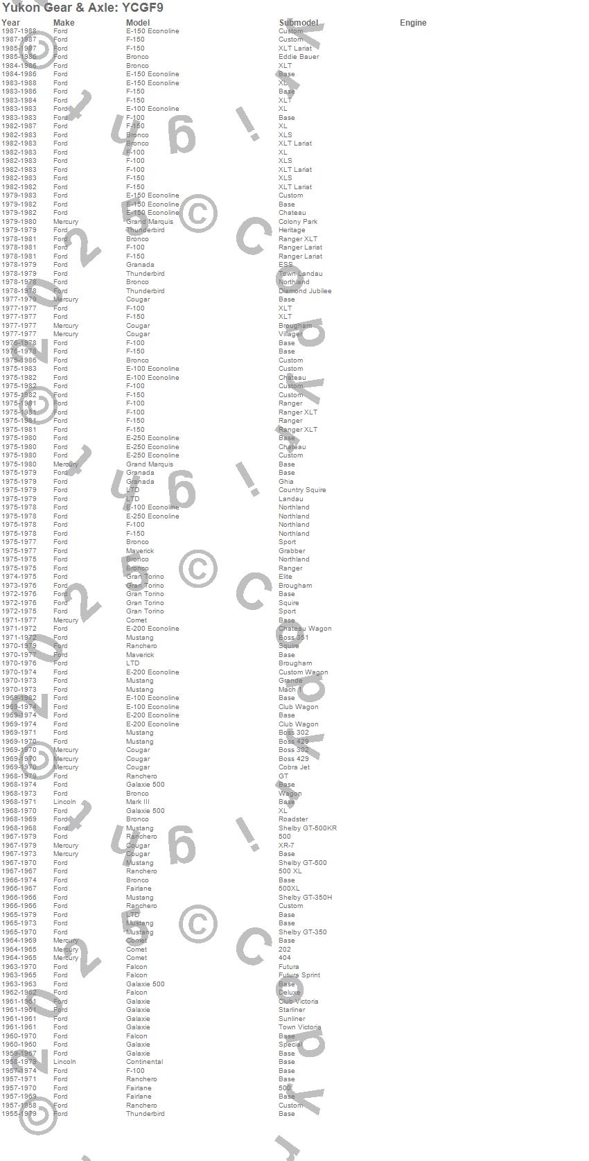 Bronco, Continental, Cougar, E-150 Econoline, E-150 Econoline Club Wagon, F-100, F-150, Fairlane, Falcon, Falcon Sedan Delivery, Galaxie, Galaxie 500, Gran Torino, Granada, LTD, Mark III, Mustang, Ranchero, Thunderbird, Torino more...