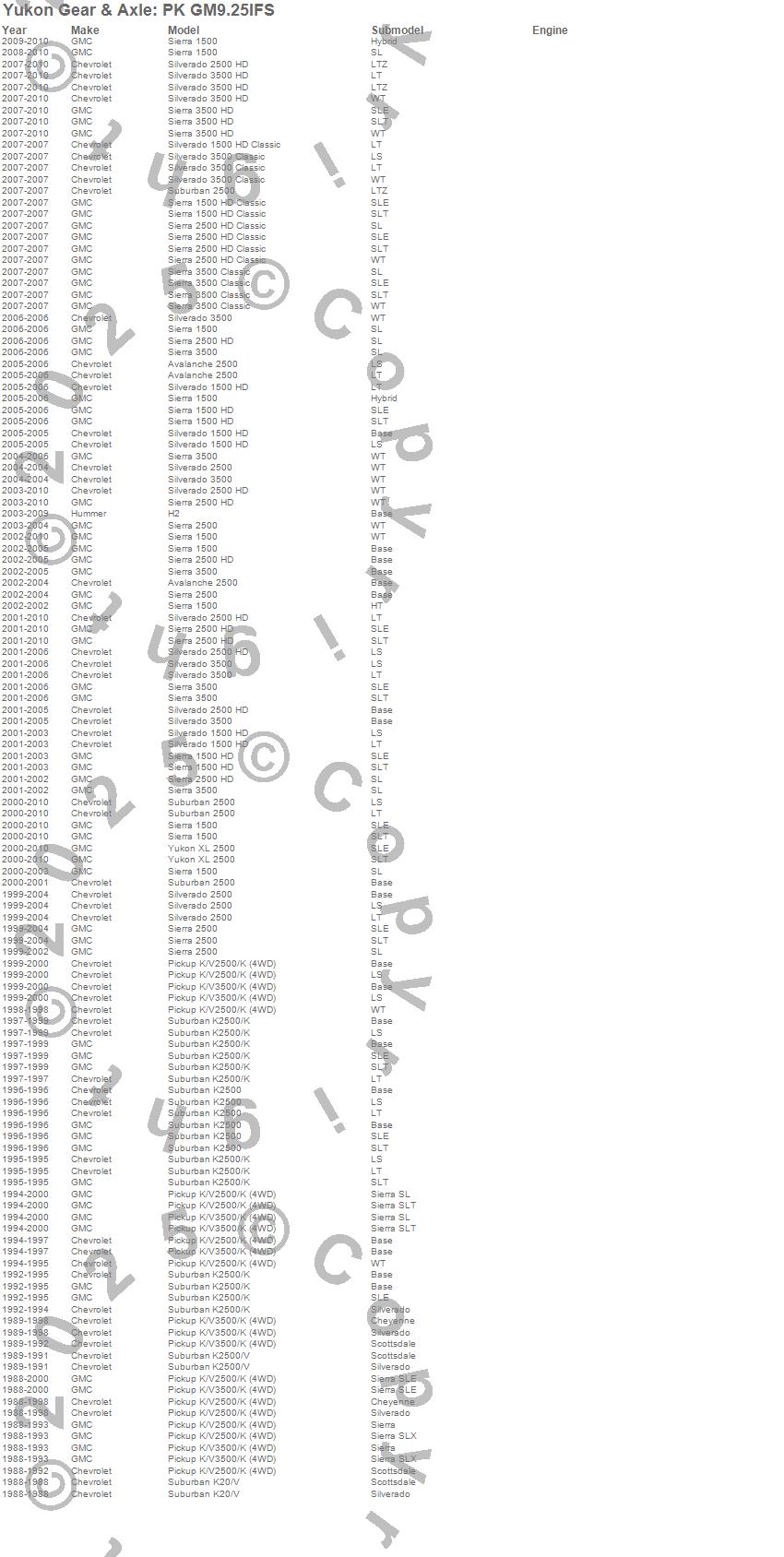 Below is an abreviated list of applications for the Pinion Install Kit.