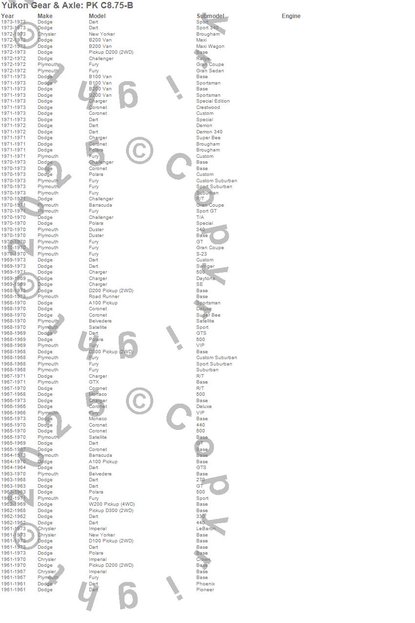 Barracuda, Belvedere, Belvedere II, Challenger, Charger, Coronet, Dart, Duster, Fury, Fury I, GTX, Imperial, ML350, Monaco, New Yorker, Polara, Road Runner, Satellite, Chrysler, Dodge more…