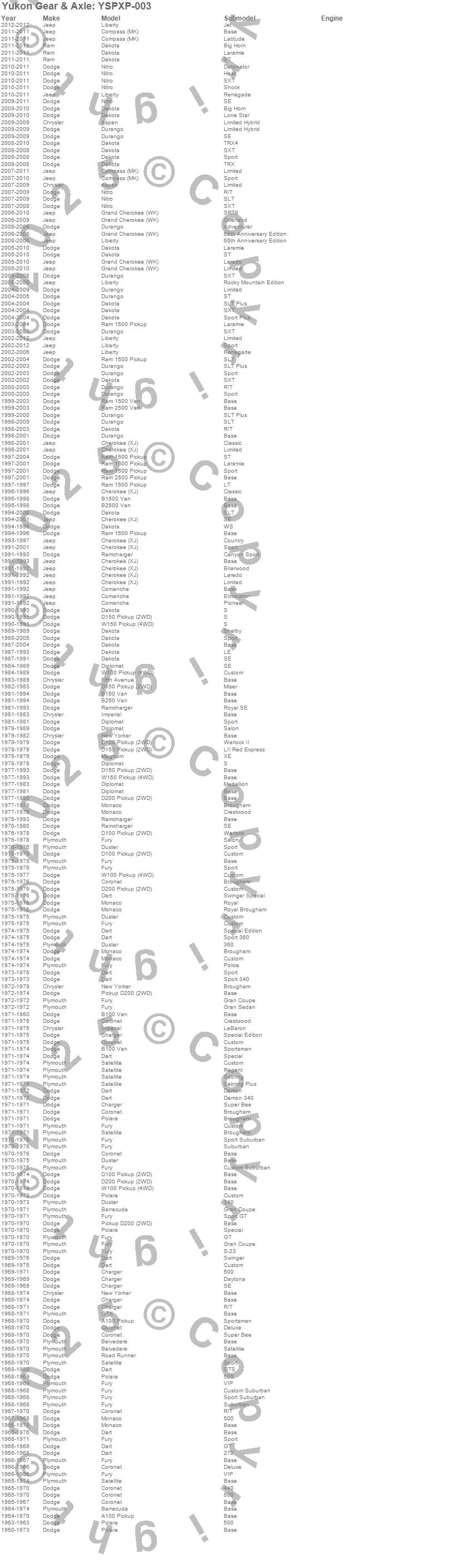 Barracuda, Belvedere, Charger, Cherokee (XJ), Coronet, D100 Pickup, D150 Pickup, Dakota, Dart, Duster, Fifth Avenue, Fury, GTX, Imperial, Liberty, Magnum, ML350, New Yorker, Polara, Ram 1500 Van more…