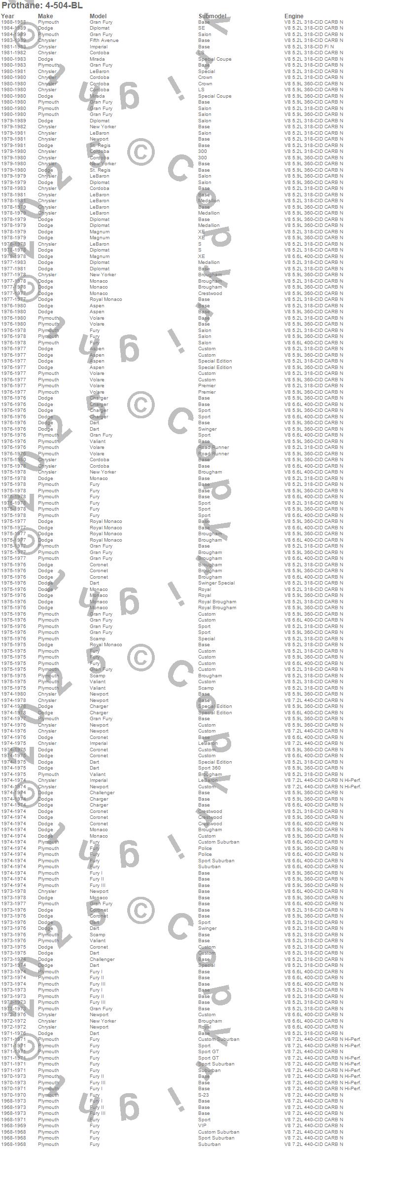 Aspen, Challenger, Charger, Cordoba, Coronet, Dart, Diplomat, Fifth Avenue, Fury, Fury I, Fury II, Fury III, Gran Fury, Imperial, LeBaron, Magnum, Mirada, Monaco, New Yorker, Newport more…
