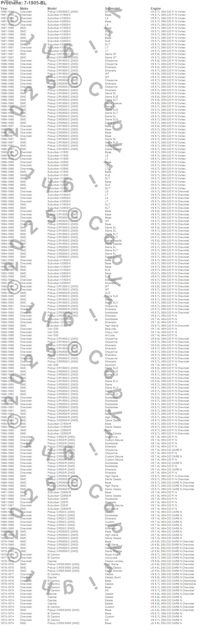 C1500, C1500 Pickup, C20 Pickup, C2500 Pickup, C30 Pickup, C35/C3500 Pickup, C3500 Pickup, Caprice, El Camino, G30, G30 Van, K1500 Suburban, K2500 Suburban, R1500 Suburban, R20 Pickup, R20 Suburban, R2500 Pickup, R2500 Suburban, R30 Pickup, R3500 Pickup more…