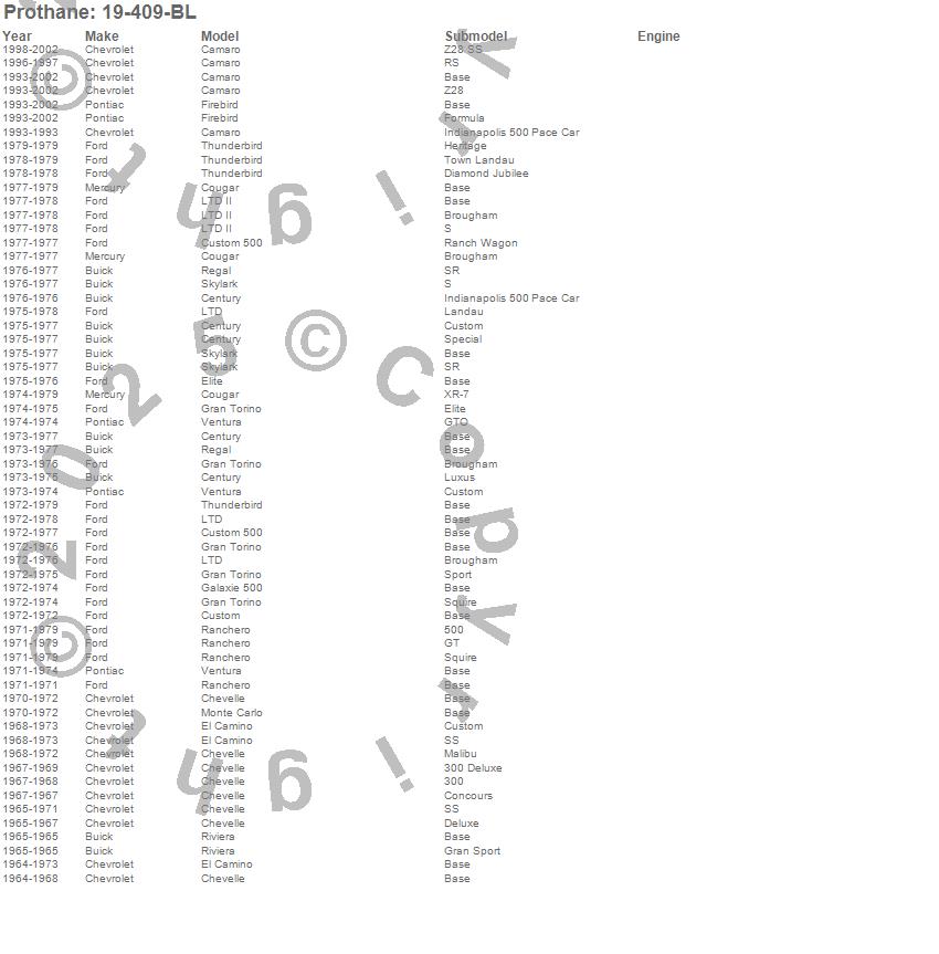 Camaro, Century, Chevelle, Cougar, Custom, Custom 500, El Camino, Elite, Firebird, Galaxie 500, Gran Torino, LTD, LTD II, Monte Carlo, Ranchero, Regal, Riviera, Skylark, Thunderbird, Ventura more…