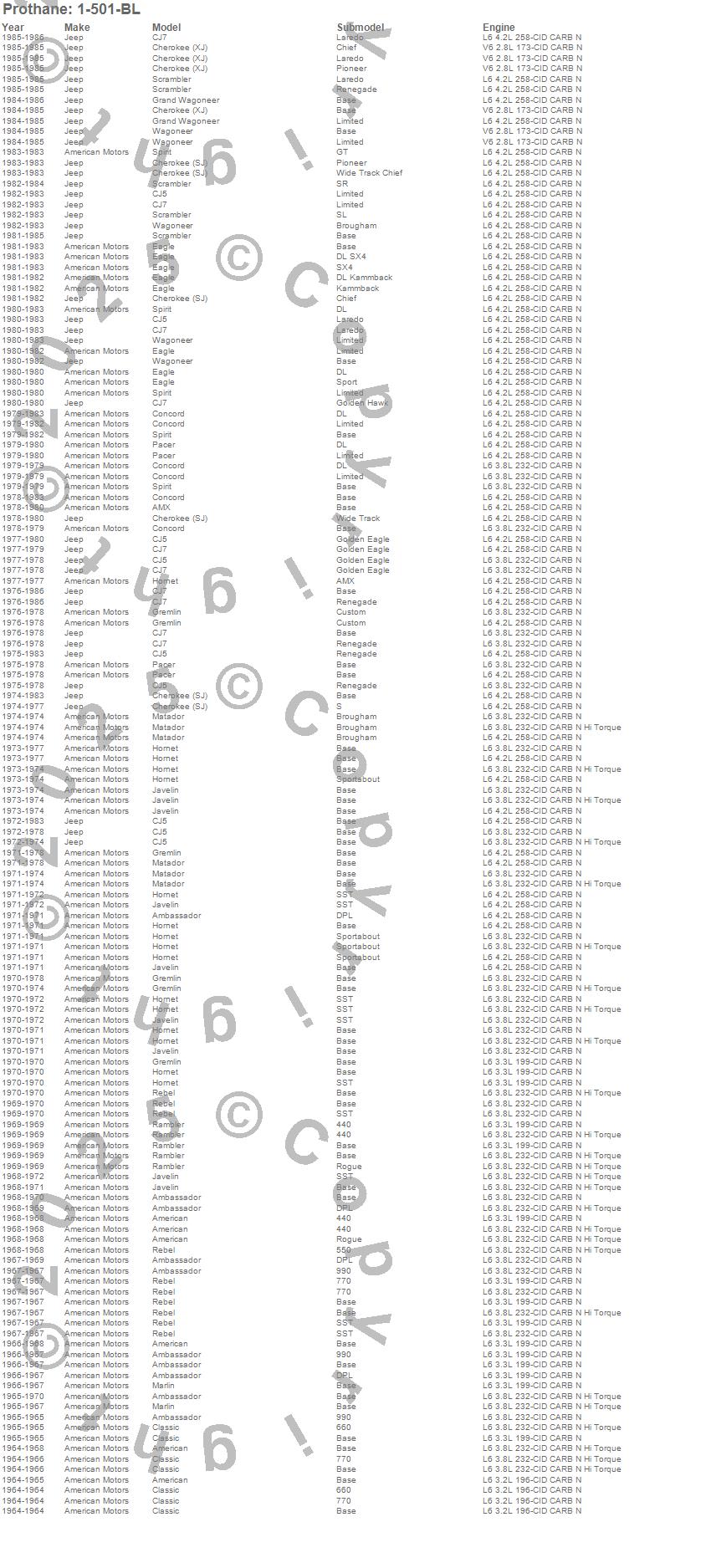 Ambassador, American, AMX, Cherokee (SJ), Cherokee (XJ), CJ5, CJ7, Classic, Concord, Eagle, Grand Wagoneer, Gremlin, Hornet, Javelin, Marlin, Matador, Pacer, Rambler, Rebel, Scrambler more…