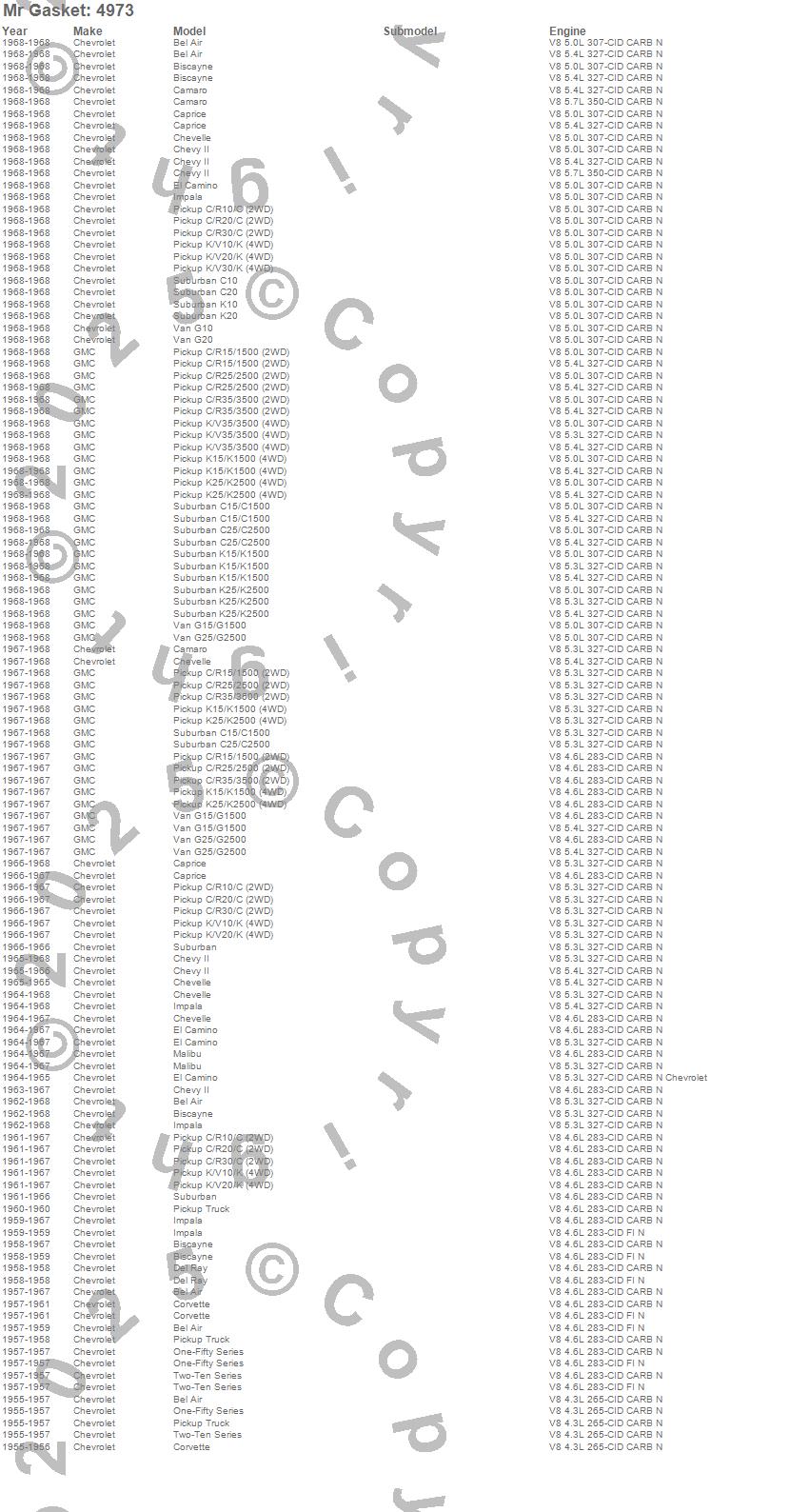 Bel Air, Biscayne, C10 Pickup, C10 Suburban, C15/C1500, C15/C1500 Suburban, C20 Pickup, C20 Suburban, C25/C2500 Pickup, C25/C2500 Suburban, C30 Pickup, C35/C3500 Pickup, Camaro, Caprice, Chevelle, Chevy II, Corvette, Del Ray, El Camino, G10 Van more…