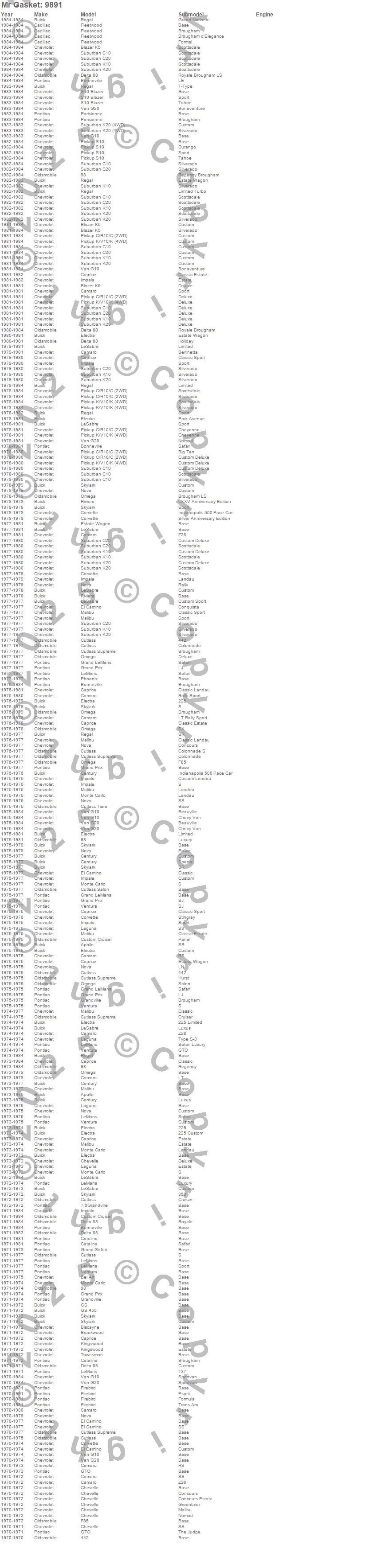 442, 98, Apollo, Bel Air, Biscayne, Blazer K5, Bonneville, Brookwood, C10 Pickup, C10 Suburban, C20 Suburban, Camaro, Caprice, Catalina, Century, Chevelle, Corvette, Custom Cruiser, Cutlass, Cutlass Salon more…