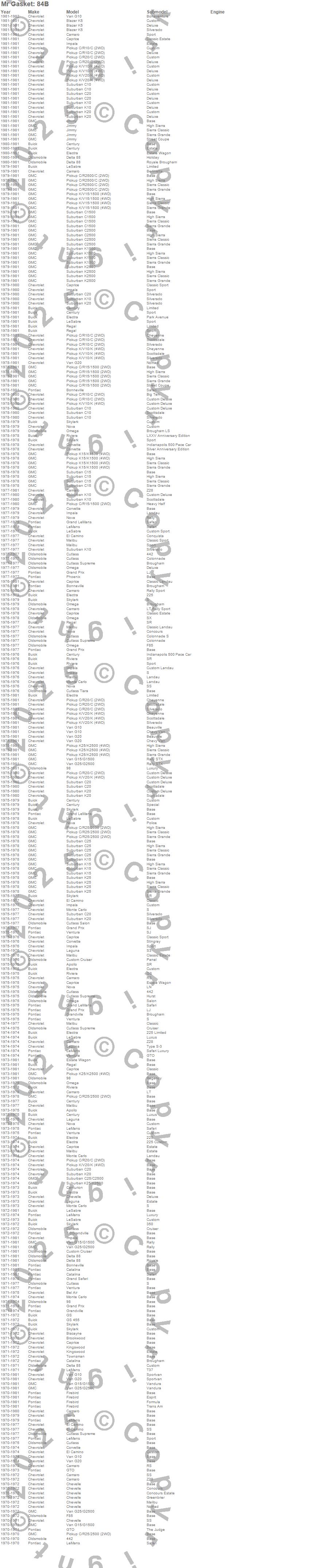 442, 98, Apollo, Bel Air, Biscayne, Blazer K5, Bonneville, Brookwood, C10 Pickup, C10 Suburban, C15 Suburban, C15/C1500, C1500, C1500 Suburban, C20 Pickup, C20 Suburban, C25 Suburban, C25/C2500 Pickup, C25/C2500 Suburban, C2500 Pickup more…