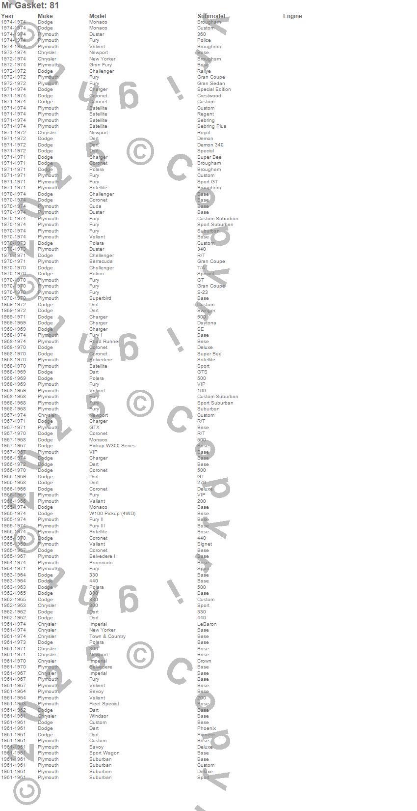 300, 330, 440, 880, Barracuda, Belvedere, Belvedere II, Challenger, Charger, Coronet, Cuda, Custom, Dart, Duster, Fleet Special, Fury, Fury I, Fury II, Fury III, Gran Fury more…