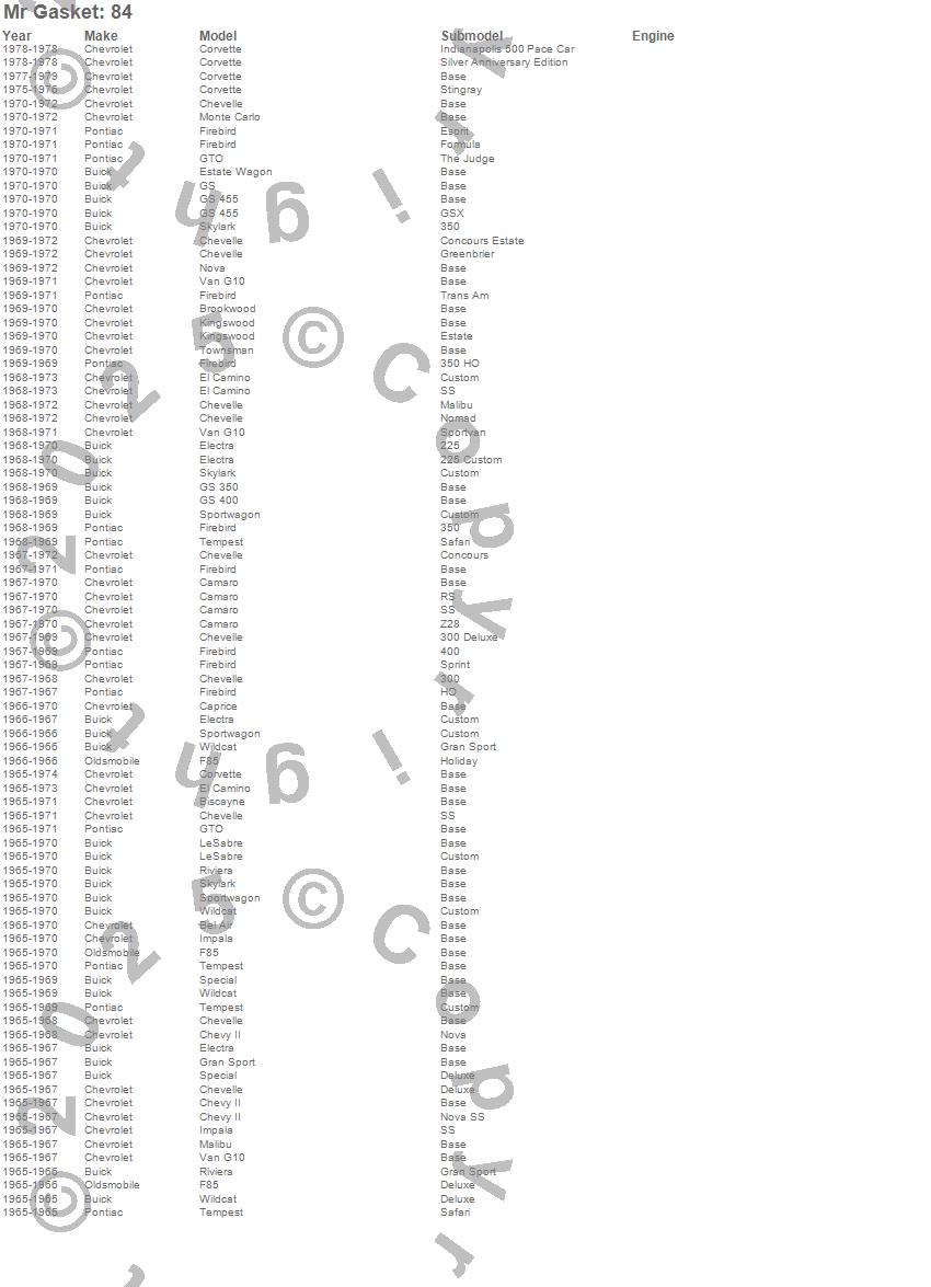 Bel Air, Biscayne, Brookwood, Camaro, Caprice, Chevelle, Chevy II, Corvette, El Camino, Electra, Estate Wagon, F85, Firebird, G10 Van, Gran Sport, GS, GS 350, GS 400, GS 455, GTO more…