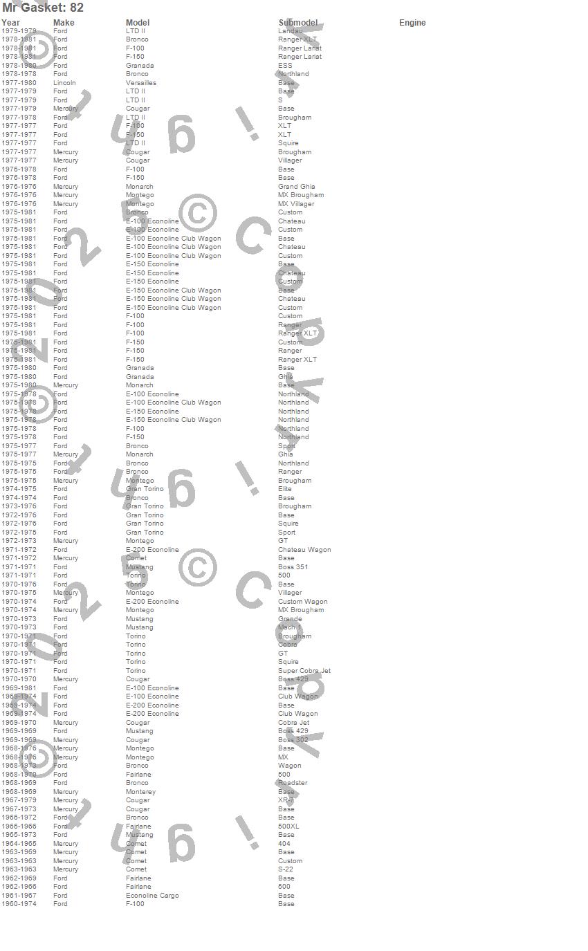 Bronco, Comet, Cougar, E-100 Econoline, E-100 Econoline Club Wagon, E-150 Econoline, E-150 Econoline Club Wagon, E-200 Econoline, Econoline Cargo, F-100, F-150, Fairlane, Gran Torino, Granada, LTD II, Monarch, Montego, Mustang, Torino, Versailles more…