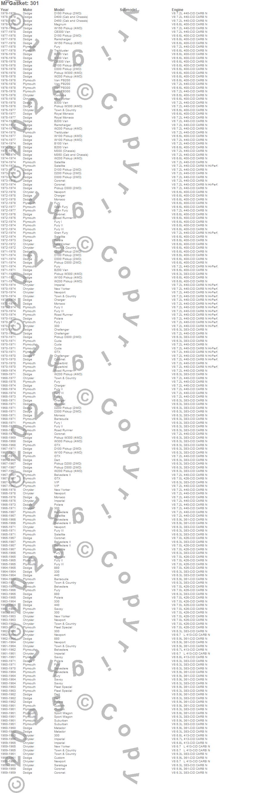 300, 330, 440, 880, B100 Van, B200 Van, B300 Van, Barracuda, Belvedere, Belvedere II, CB300 Van, Challenger, Charger, Cordoba, Coronet, Cuda, Custom, D100 Pickup, D150 Pickup, D200 Pickup more...