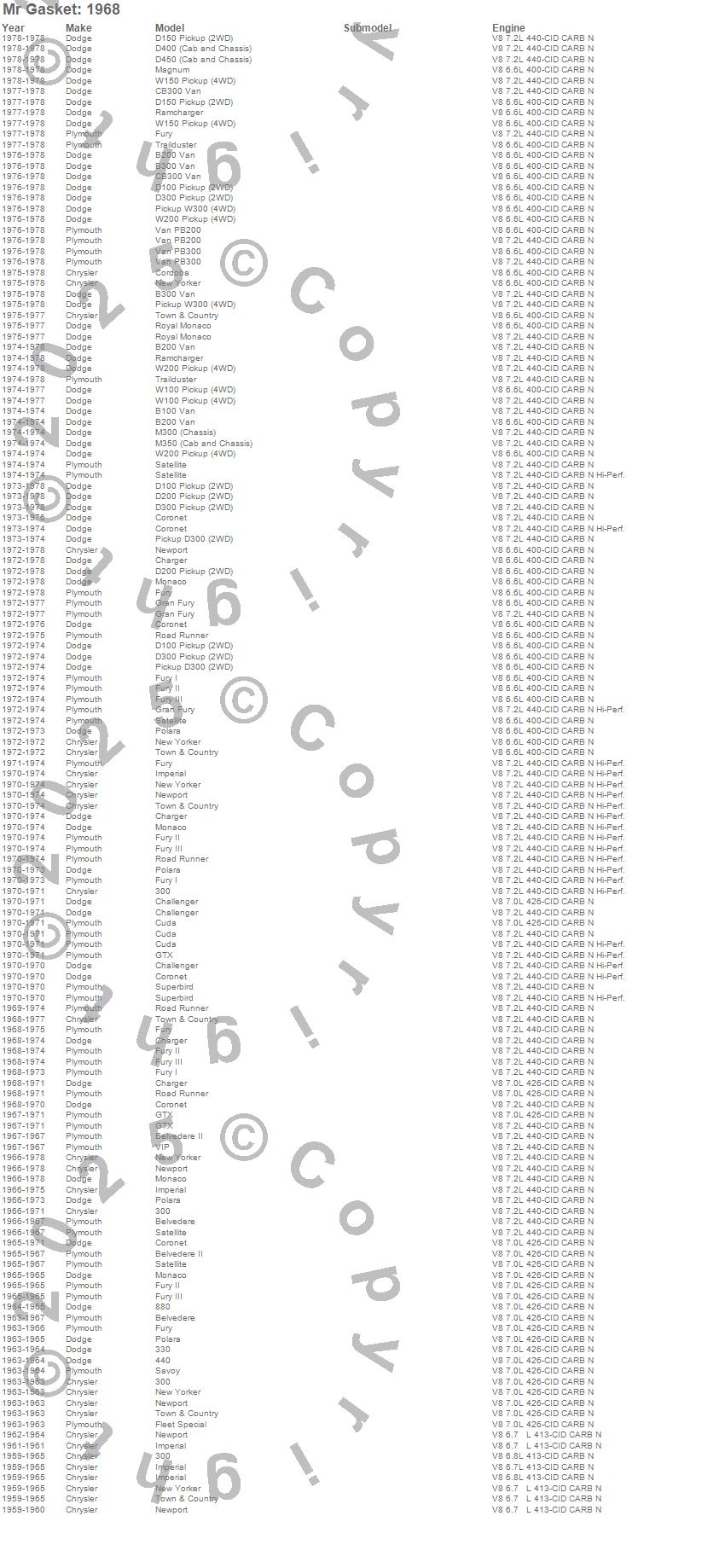300, 330, 440, 880, B100 Van, B200 Van, B300 Van, Belvedere, Belvedere II, CB300 Van, Challenger, Charger, Cordoba, Coronet, Cuda, Custom, D100 Pickup, D150 Pickup, D200 Pickup, D300 Pickup more…