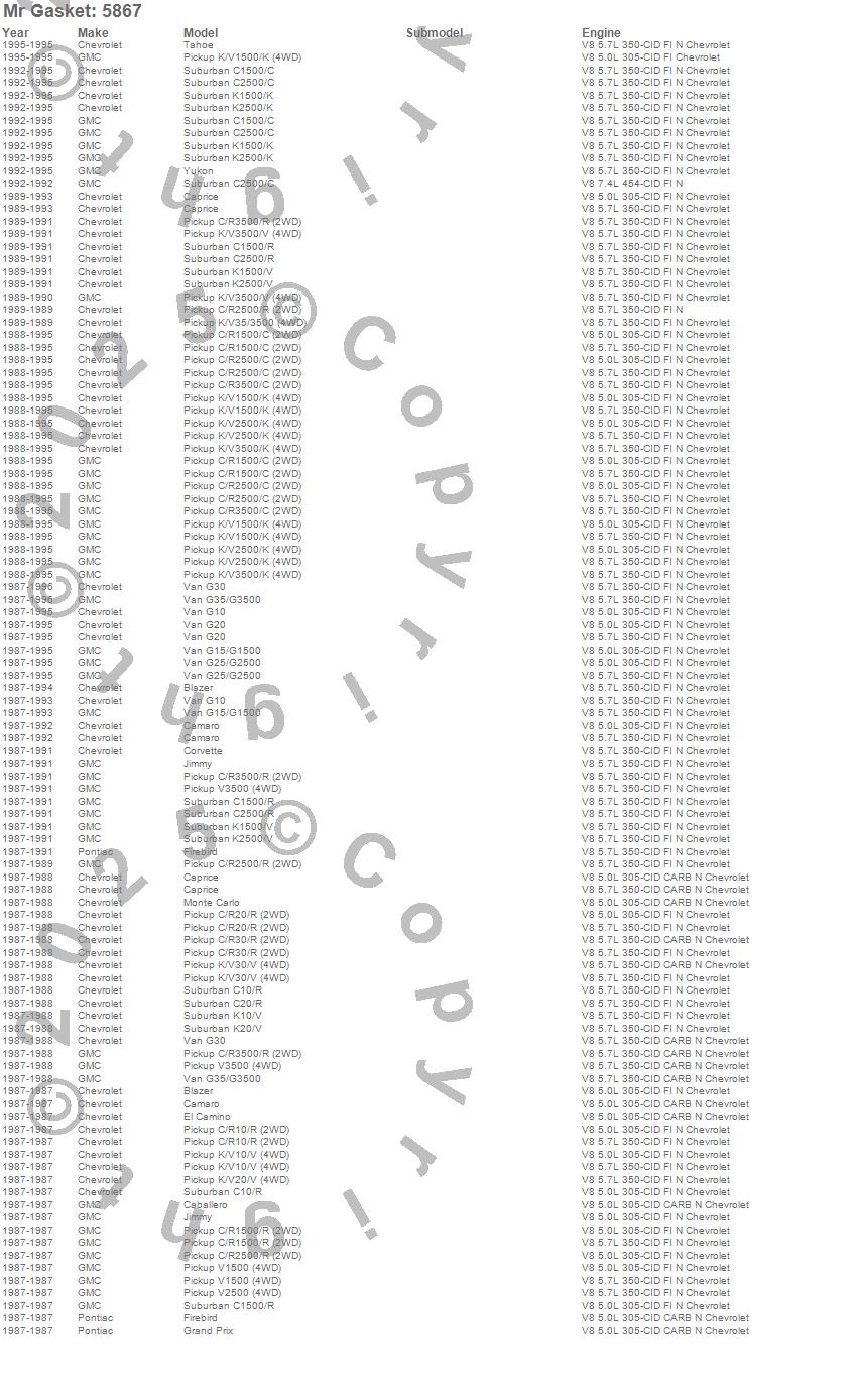 Blazer, C1500, C1500 Pickup, C1500 Suburban, C2500 Pickup, C2500 Suburban, C3500 Pickup, Caballero, Camaro, Caprice, Corvette, El Camino, Firebird, G10 Van, G15/G1500 Van, G20 Van, G25/G2500 Van, G30 Van, G35/G3500 Van, Grand Prix more…