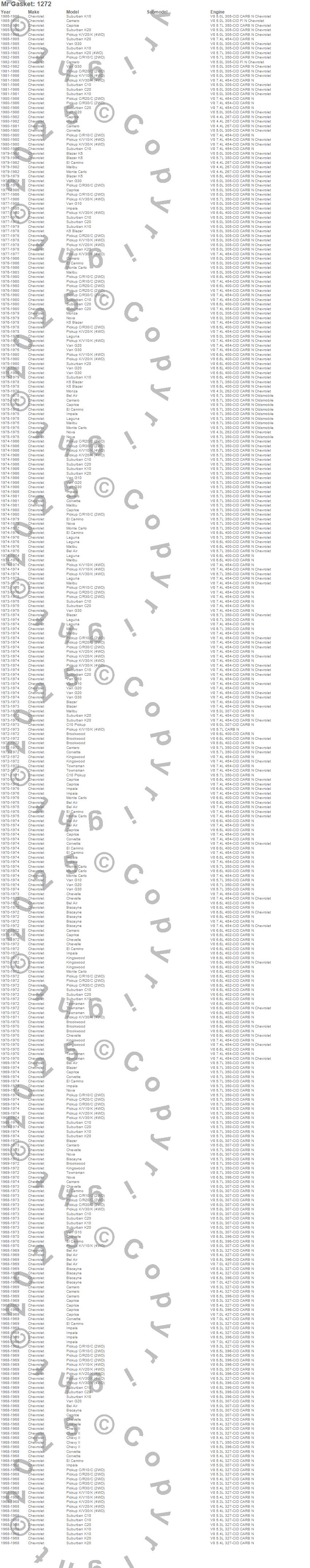 Bel Air, Biscayne, Blazer, Blazer K5, Brookwood, C10 Pickup, C10 Suburban, C20 Pickup, C20 Suburban, C30 Pickup, Camaro, Caprice, Chevelle, Chevy II, Corvette, El Camino, G10 Van, G20 Van, G30 Van, Impala more…