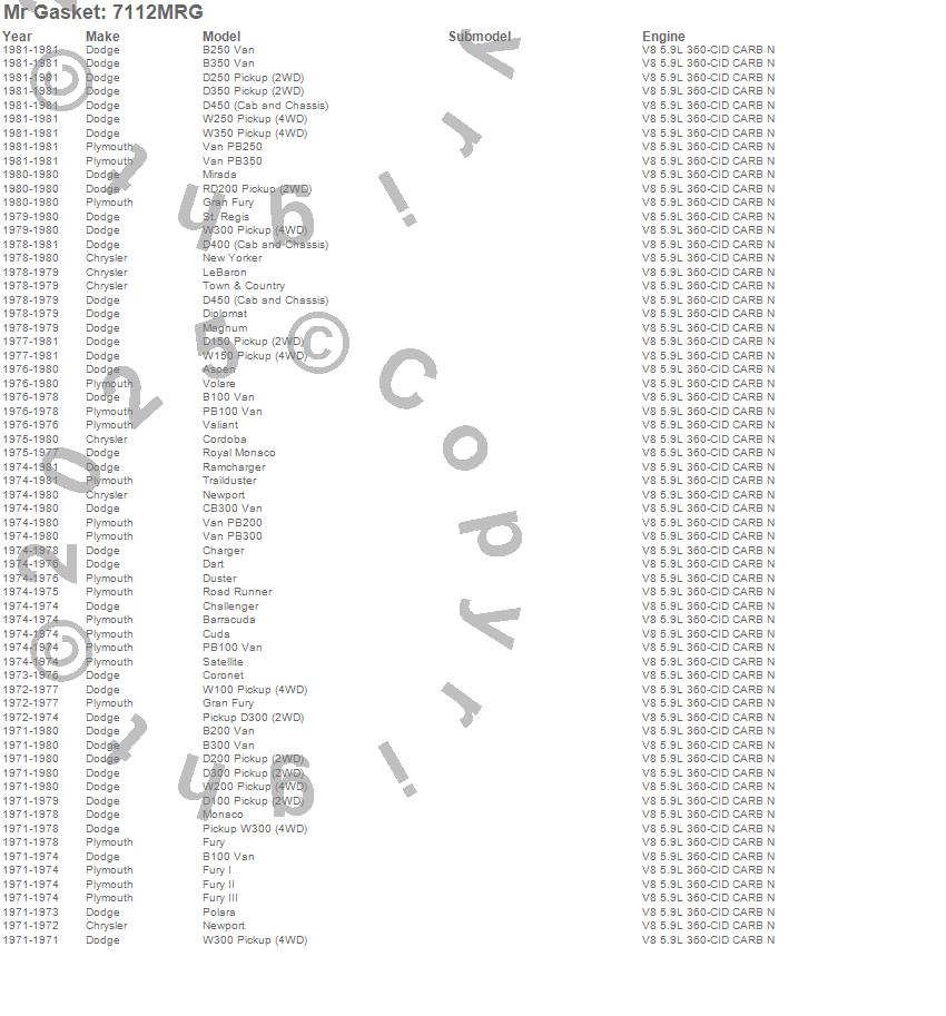 Aspen, B100 Van, B200 Van, B250 Van, B300 Van, B350 Van, Barracuda, CB300 Van, Challenger, Charger, Cordoba, Coronet, Cuda, D100 Pickup, D150 Pickup, D200 Pickup, D250 Pickup, D300 Pickup, D350 Pickup, D450 Pickup more…
