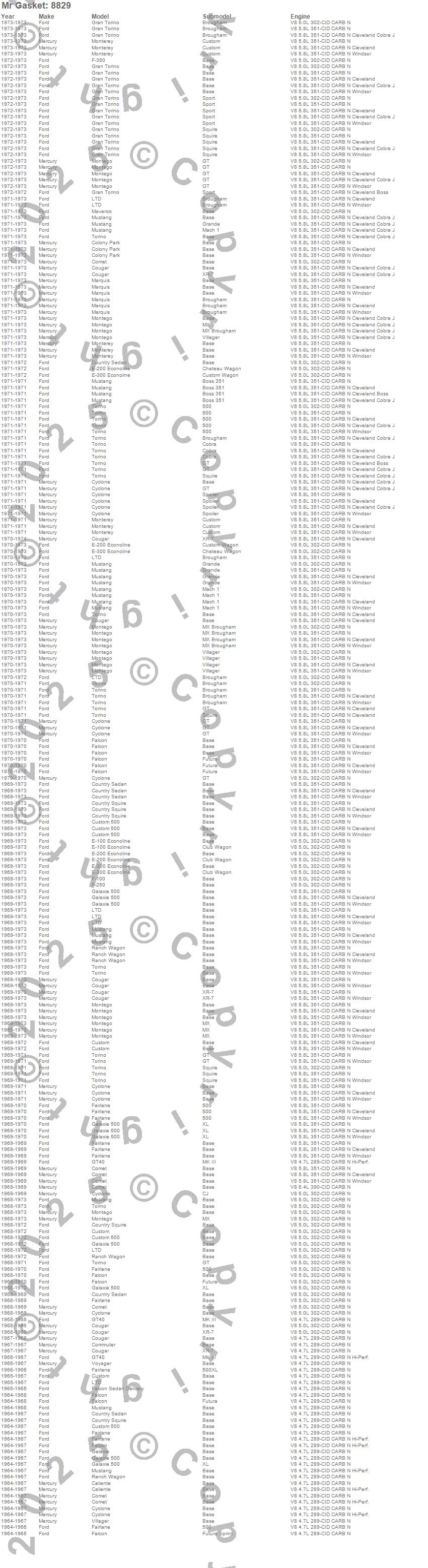 Caliente, Club Cargo, Colony Park, Comet, Commuter, Cougar, Country Sedan, Country Squire, Custom, Custom 500, Cyclone, E-100 Econoline, E-200 Econoline, E-300 Econoline, F-100, F-250, F-350, Fairlane, Falcon, Falcon Sedan Delivery more…