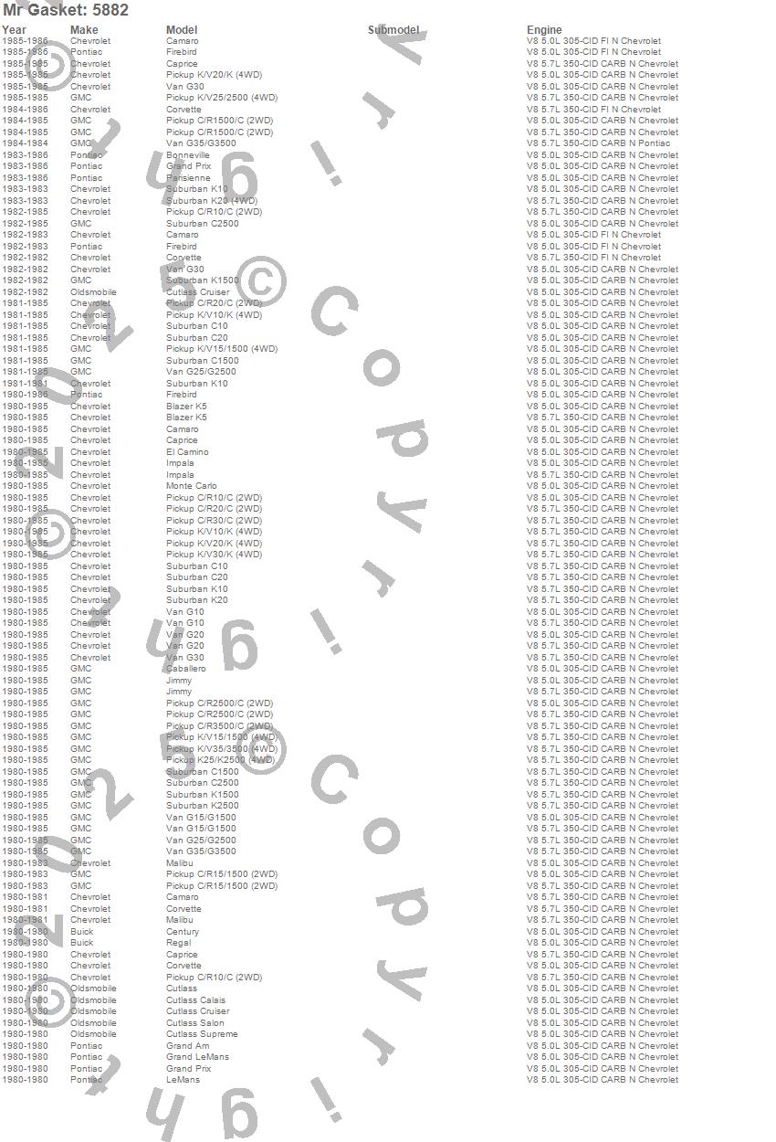Below is an abreviated list of applications for the Ultra Seal Oil Pan Gasket.