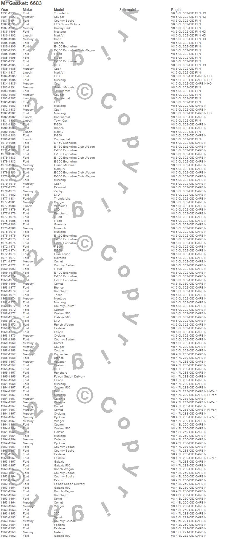 Bronco, Caliente, Capri, Club Cargo, Colony Park, Comet, Commuter, Continental, Cougar, Country Cruiser, Country Sedan, Country Squire, Custom, Custom 500, Cyclone, E-100 Econoline, E-150 Econoline, E-150 Econoline Club Wagon, E-200 Econoline, E-250 Econoline more…
