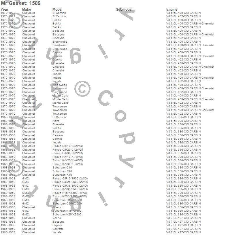 Bel Air, Biscayne, Brookwood, C10 Pickup, C10 Suburban, C15/C1500, C15/C1500 Suburban, C20 Pickup, C20 Suburban, C25/C2500 Pickup, C25/C2500 Suburban, C30 Pickup, C35/C3500 Pickup, Camaro, Caprice, Chevelle, Chevy II, Corvette, El Camino, Impala more…
