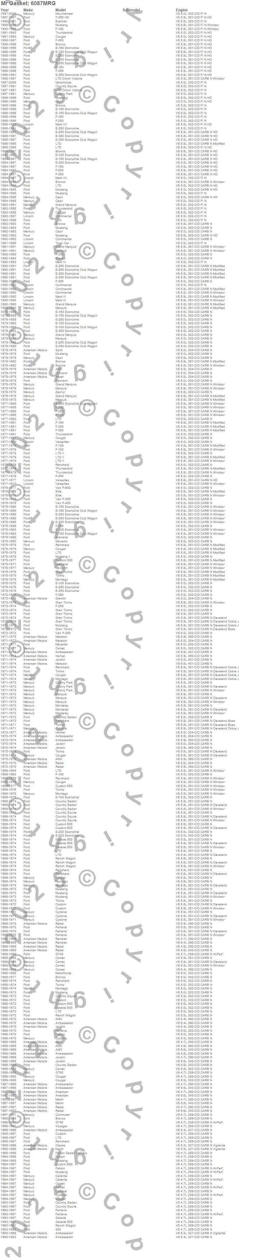 Ambassador, American, AMX, Bronco, Caliente, Capri, Classic, Club Cargo, Colony Park, Comet, Commuter, Concord, Continental, Cougar, Country Sedan, Country Squire, Custom, Custom 500, Cyclone, E-100 Econoline more…