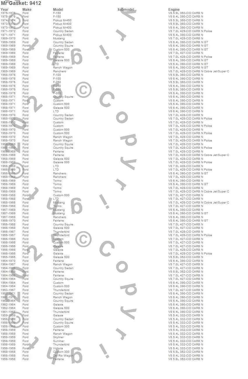 Club Cargo, Country Sedan, Country Squire, Custom, Custom 300, Custom 500, Del Rio Wagon, F-100, F-150, F-250, F-350, Fairlane, Galaxie, Galaxie 500, LTD, M-400 (Pickup), M-450, Mustang, Ranch Wagon, Ranchero more…