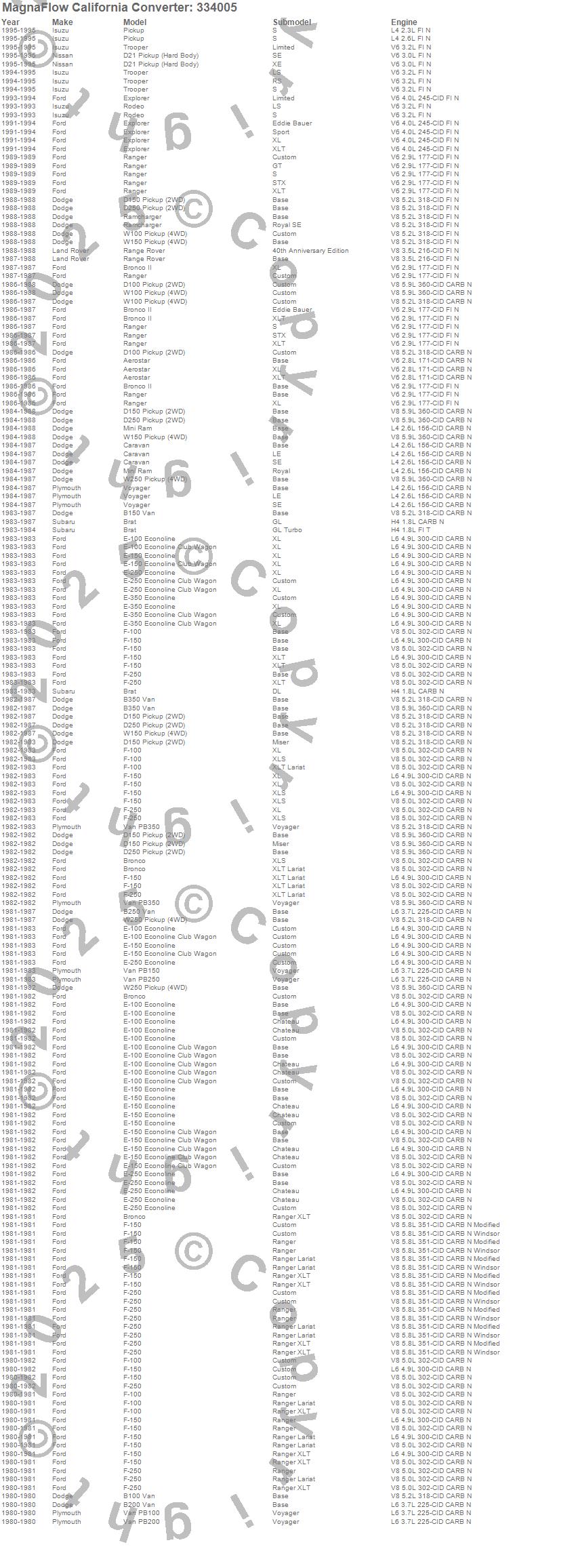 Below is an abreviated list of applications for the Universal California Catalytic Converter.