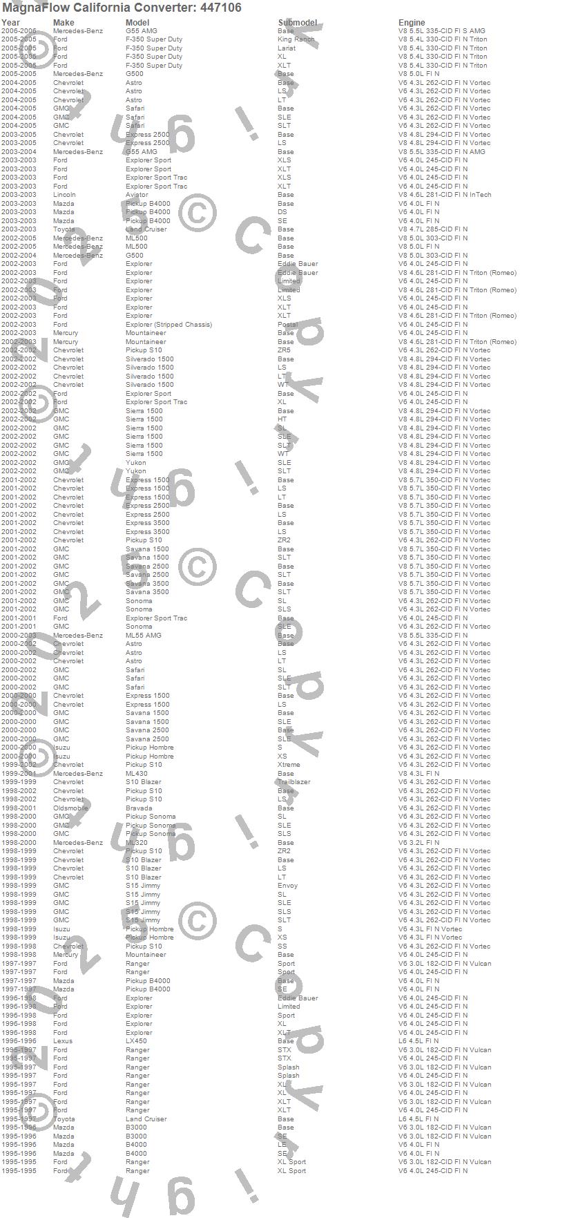 Below is an abreviated list of applications for the Universal California Catalytic Converter.