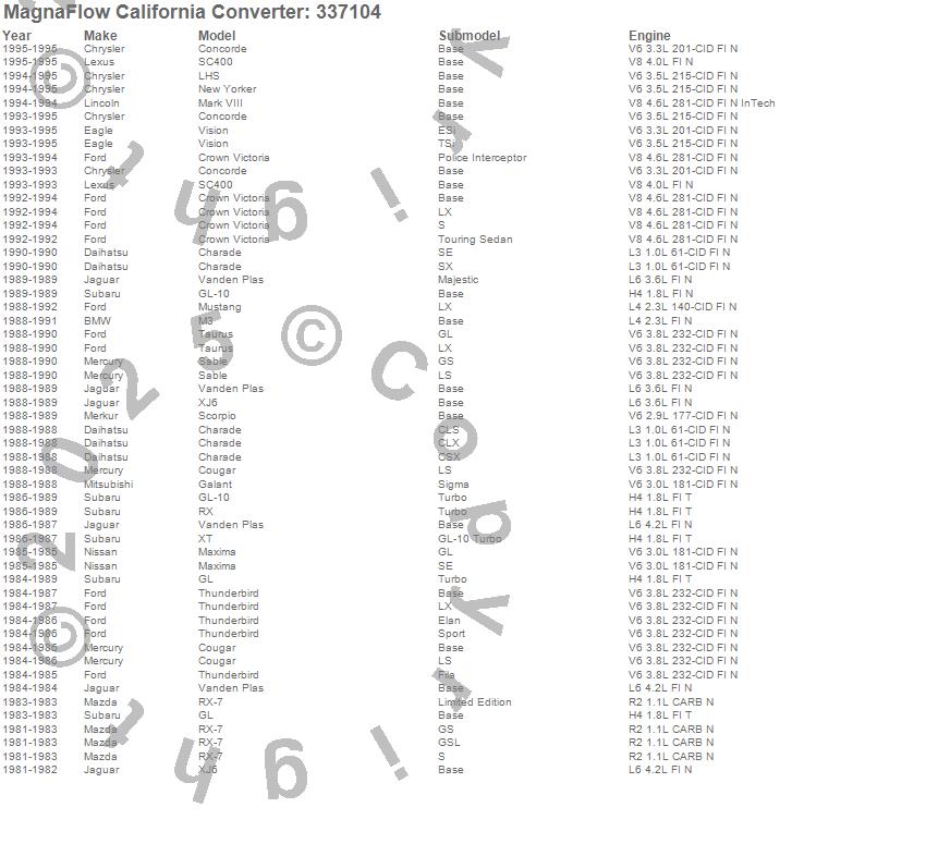 Below is an abreviated list of applications for the Universal California Catalytic Converter.