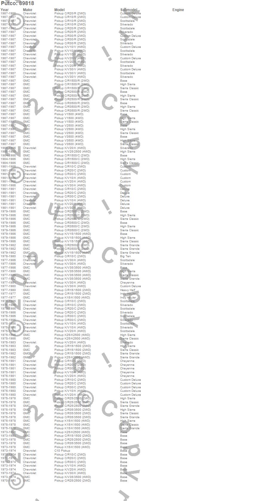 C10 Pickup, C15/C1500, C1500, C20 Pickup, C25/C2500 Pickup, C2500 Pickup, C30 Pickup, C35/C3500 Pickup, C3500 Pickup, K10 Pickup, K15/K1500, K1500, K20 Pickup, K25 Pickup, K25/K2500 Pickup, K2500 Pickup, K30 Pickup, K35 Pickup, K35/K3500 Pickup, K3500 Pickup more…