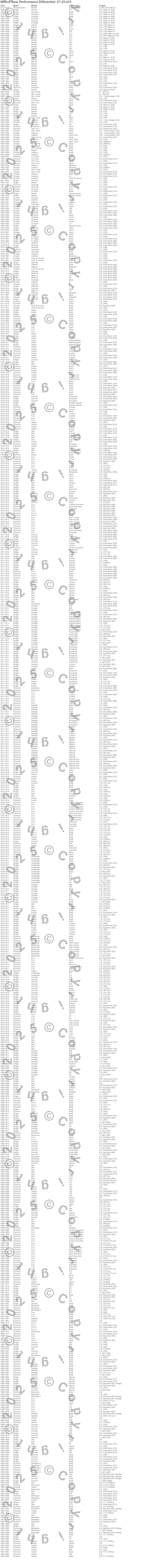 Aspen, Barracuda, Belvedere, Belvedere II, Caravelle, Challenger, Charger, Cordoba, Coronet, Dakota, Dart, Diplomat, Durango, Duster, Fifth Avenue, Fury, Fury I, Fury II, Fury III, Gran Fury more…