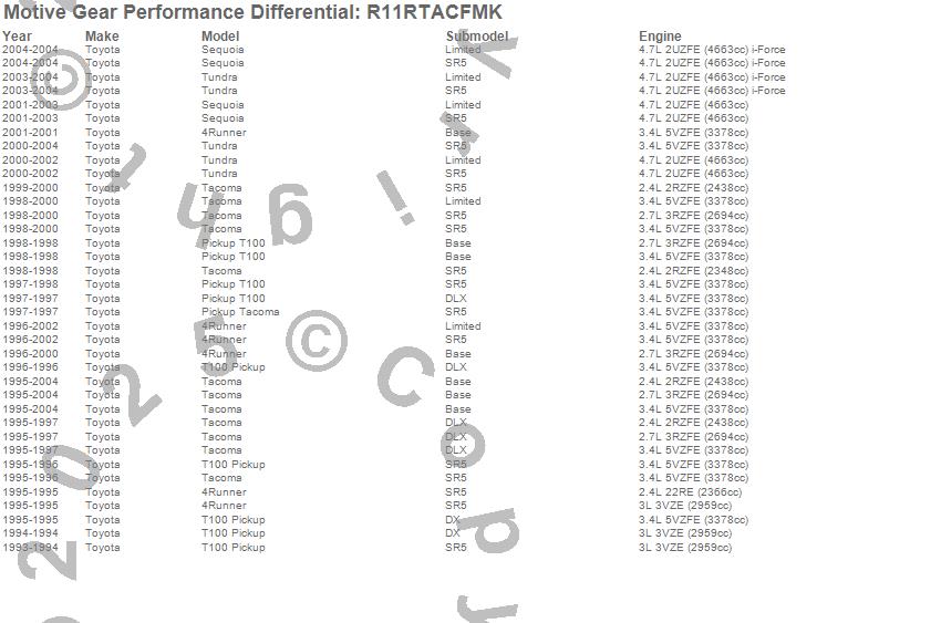 Below is an abreviated list of applications for the Ring And Pinion Installation Kit.