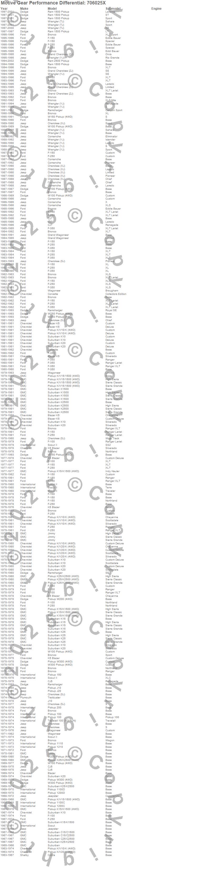 200 Pickup, Blazer, Blazer K5, Bronco, C15/C1500 Suburban, C25/C2500 Suburban, Cherokee (SJ), Cherokee (XJ), CJ5, CJ6, CJ7, Cobra, Comanche, Corvette, F-100, F-150, F-250, F-350, Grand Cherokee (ZJ), Grand Wagoneer more…