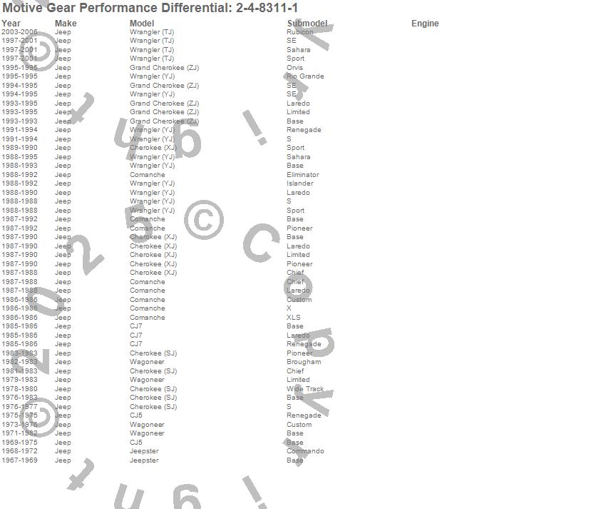 Cherokee (SJ), Cherokee (XJ), CJ5, CJ7, Comanche, Grand Cherokee (ZJ), Jeepster, Wagoneer, Wrangler (TJ), Wrangler (YJ), Jeep, 2006, 2005, 2004, 2003, 2001, 2000, 1999, 1998, 1997 more…