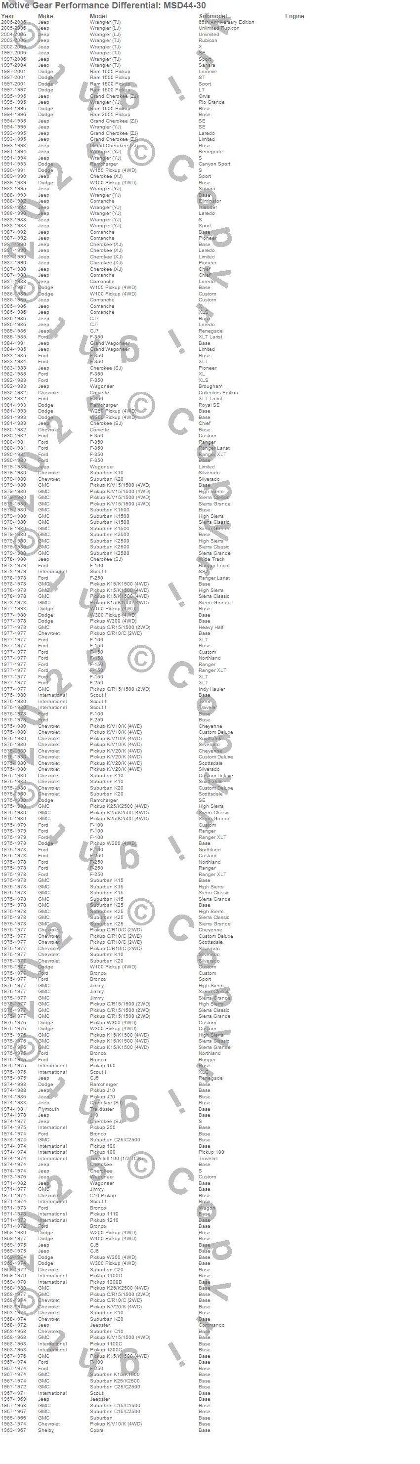 200 Pickup, Bronco, C10 Pickup, C10 Suburban, C15/C1500, C15/C1500 Suburban, C20 Suburban, C25/C2500 Suburban, Cherokee (SJ), Cherokee (XJ), CJ5, CJ6, CJ7, Cobra, Comanche, Corvette, F-100, F-150, F-250, F-350 more…