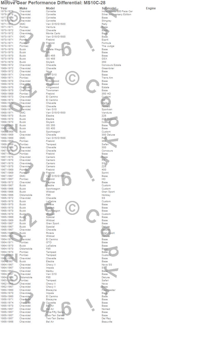 Bel Air, Biscayne, Brookwood, Camaro, Caprice, Chevelle, Chevy II, Corvette, El Camino, Electra, Estate Wagon, F85, Firebird, G10 Van, G15/G1500 Van, Gran Sport, GS, GS 350, GS 400, GS 455 more…