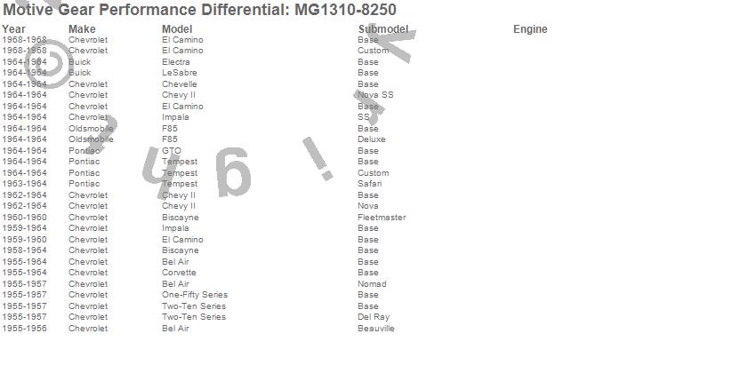 Bel Air, Biscayne, Chevelle, Chevy II, Corvette, El Camino, Electra, F85, GTO, Impala, LeSabre, One-Fifty Series, Tempest, Two-Ten Series, Buick, Chevrolet, Oldsmobile, Pontiac, 1968, 1964 more…