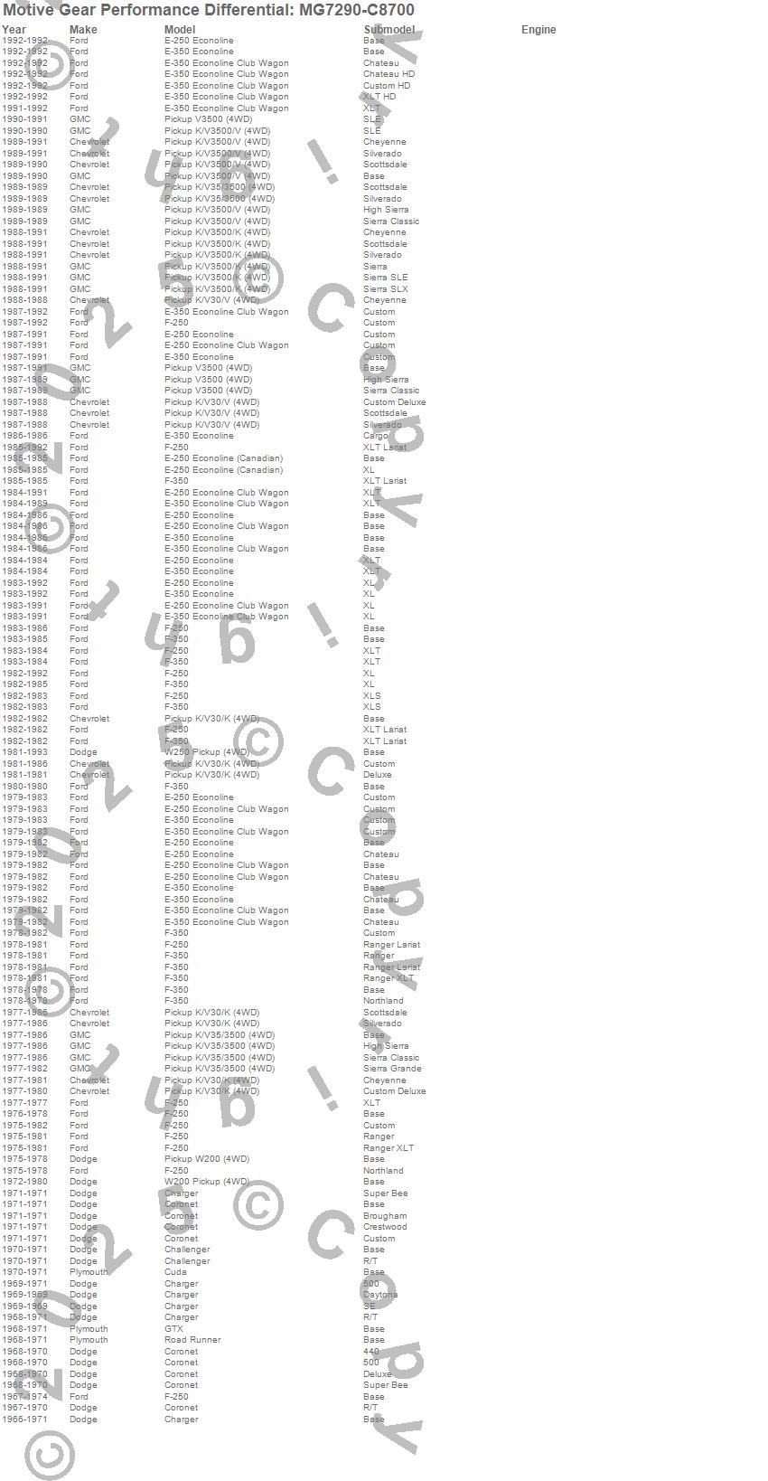 Challenger, Charger, Coronet, Cuda, E-250 Econoline, E-250 Econoline Club Wagon, E-350 Econoline, E-350 Econoline Club Wagon, F-250, F-350, GTX, K30 Pickup, K35 Pickup, K3500 Pickup, Road Runner, V30 Pickup, V3500 Pickup, W200 Pickup, W250 Pickup, Chevrolet more…