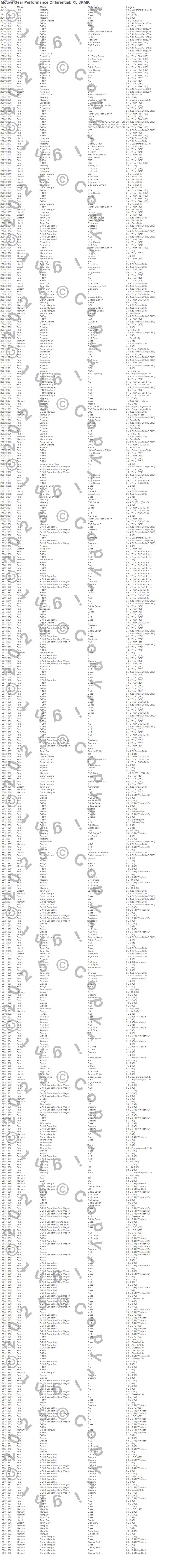Aerostar, Bronco, Capri, Cougar, Crown Victoria, E-150 Econoline, E-150 Econoline Club Wagon, E-250 Econoline, E-250 Econoline Club Wagon, Expedition, Explorer, Explorer Sport Trac, F-150, F-150 Heritage, F-250, Grand Marquis, Marauder, Marquis, Mountaineer, Mustang more…