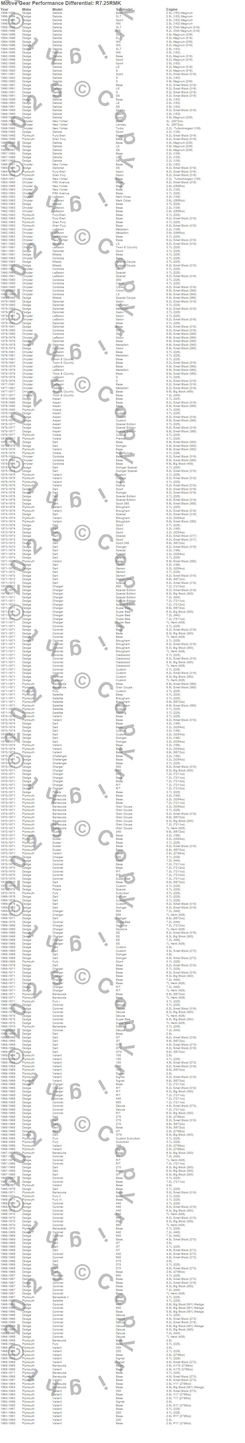Aspen, Barracuda, Belvedere, Belvedere II, Challenger, Charger, Cordoba, Coronet, Dakota, Dart, Diplomat, Duster, Fifth Avenue, Fury, Fury I, Fury II, Fury III, Gran Fury, LeBaron, Mirada more…