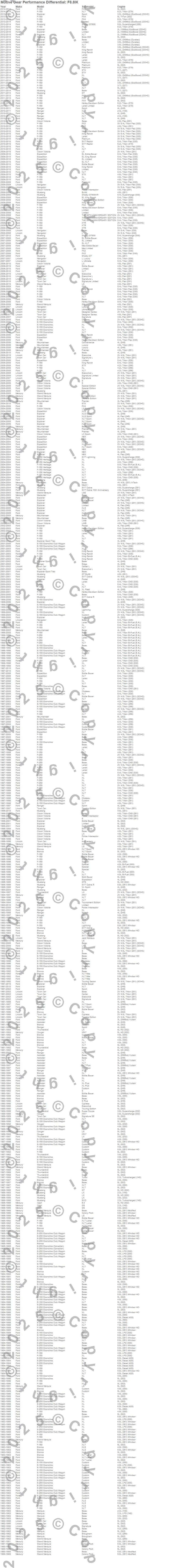 Aerostar, Bronco, Capri, Cougar, Crown Victoria, E-150 Econoline, E-150 Econoline Club Wagon, E-250 Econoline, E-250 Econoline Club Wagon, Expedition, Explorer, Explorer Sport Trac, F-150, F-150 Heritage, F-250, Grand Marquis, Marauder, Marquis, Mountaineer, Mustang more…