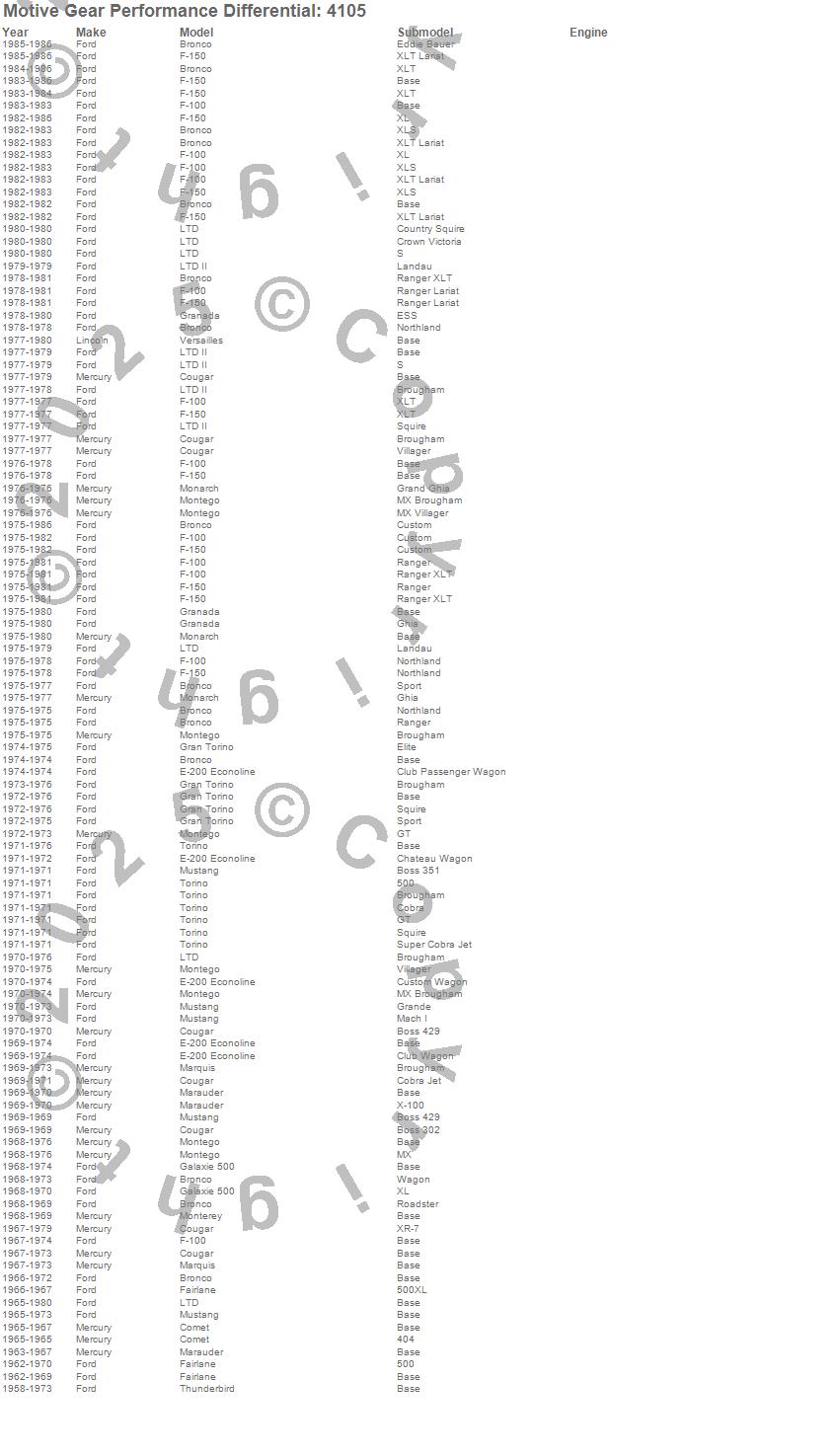 Bronco, Comet, Cougar, E-200 Econoline, F-100, F-150, Fairlane, Galaxie 500, Gran Torino, Granada, LTD, LTD II, Marauder, Marquis, Monarch, Montego, Mustang, Thunderbird, Torino, Versailles more…