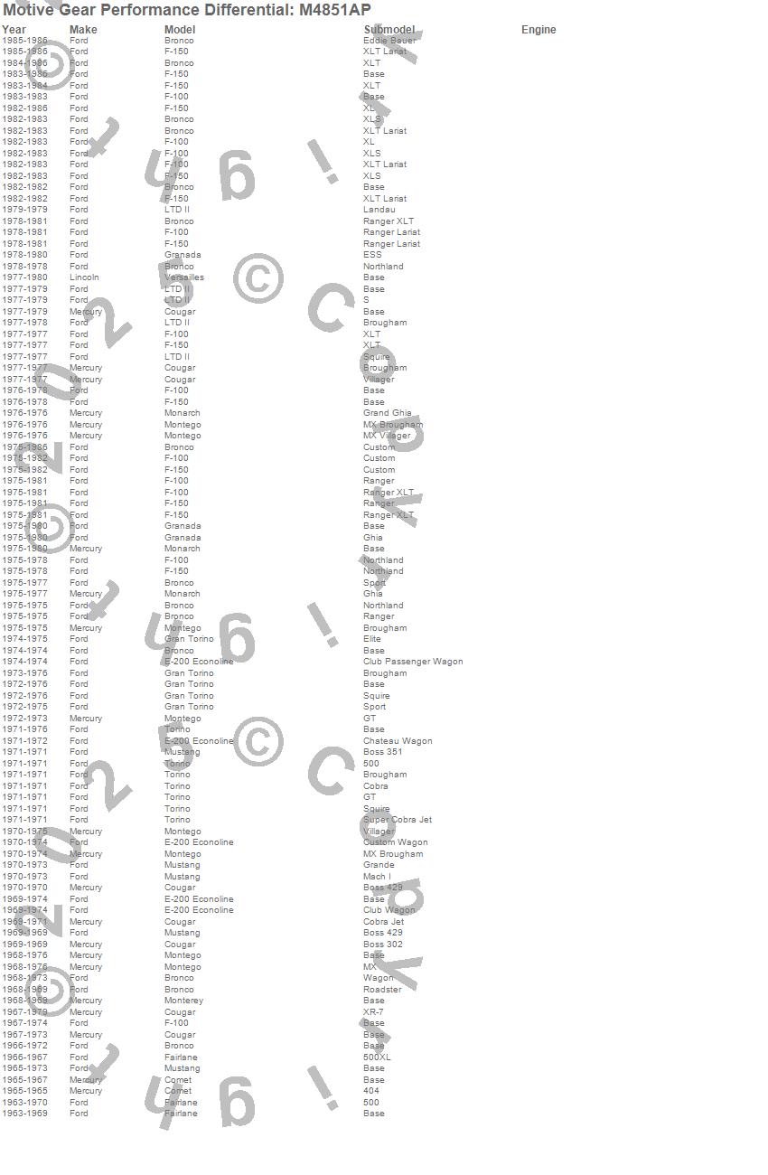 Bronco, Comet, Cougar, E-200 Econoline, F-100, F-150, Fairlane, Gran Torino, Granada, LTD II, Monarch, Montego, Mustang, Torino, Versailles, Ford, Lincoln, Mercury, 1986, 1985 more…