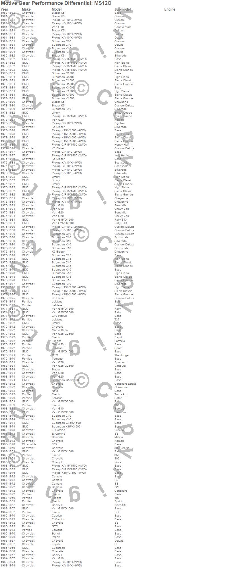 Bel Air, Blazer, Blazer K5, C10 Pickup, C10 Suburban, C15 Suburban, C15/C1500, C15/C1500 Suburban, C1500, C1500 Suburban, Camaro, Caprice, Chevelle, Chevy II, El Camino, F85, Firebird, G10 Van, G15/G1500 Van, G20 Van more…